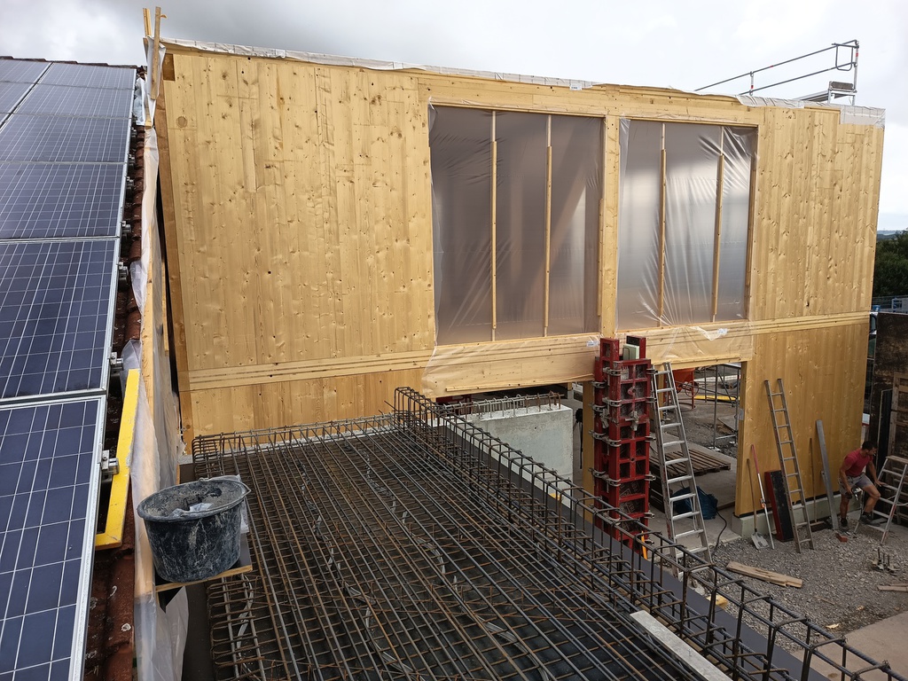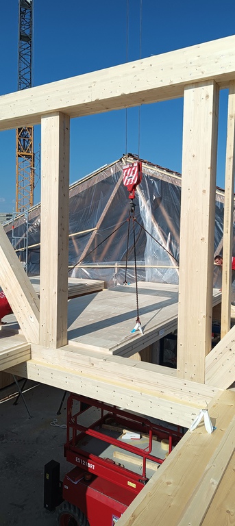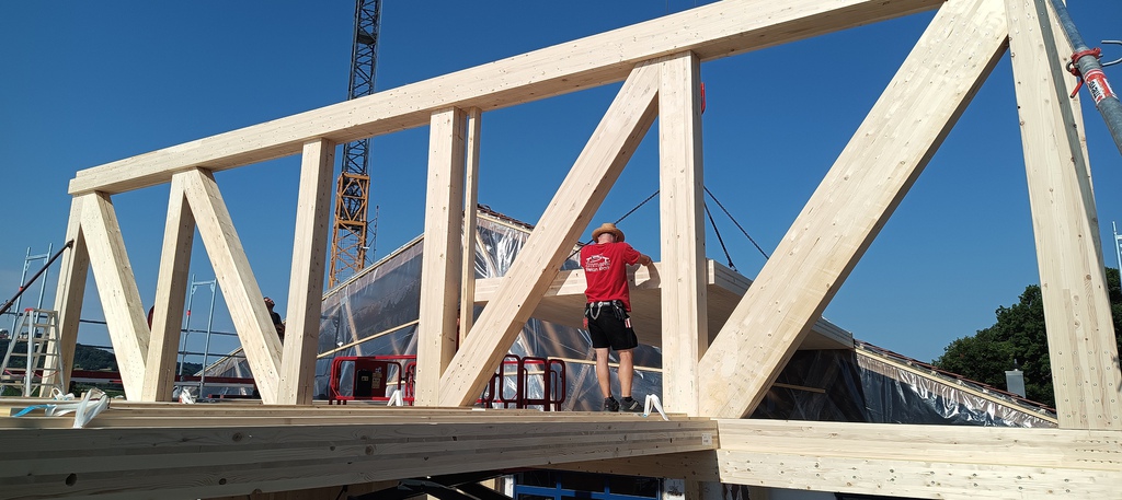 mit freitragender Holzfachwerkkonstruktion